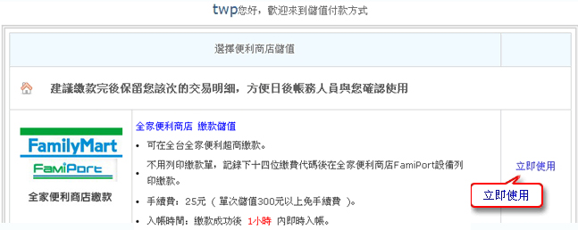 步驟四:在 全家便利商店 繳款儲值表單中,選擇「立即使用」